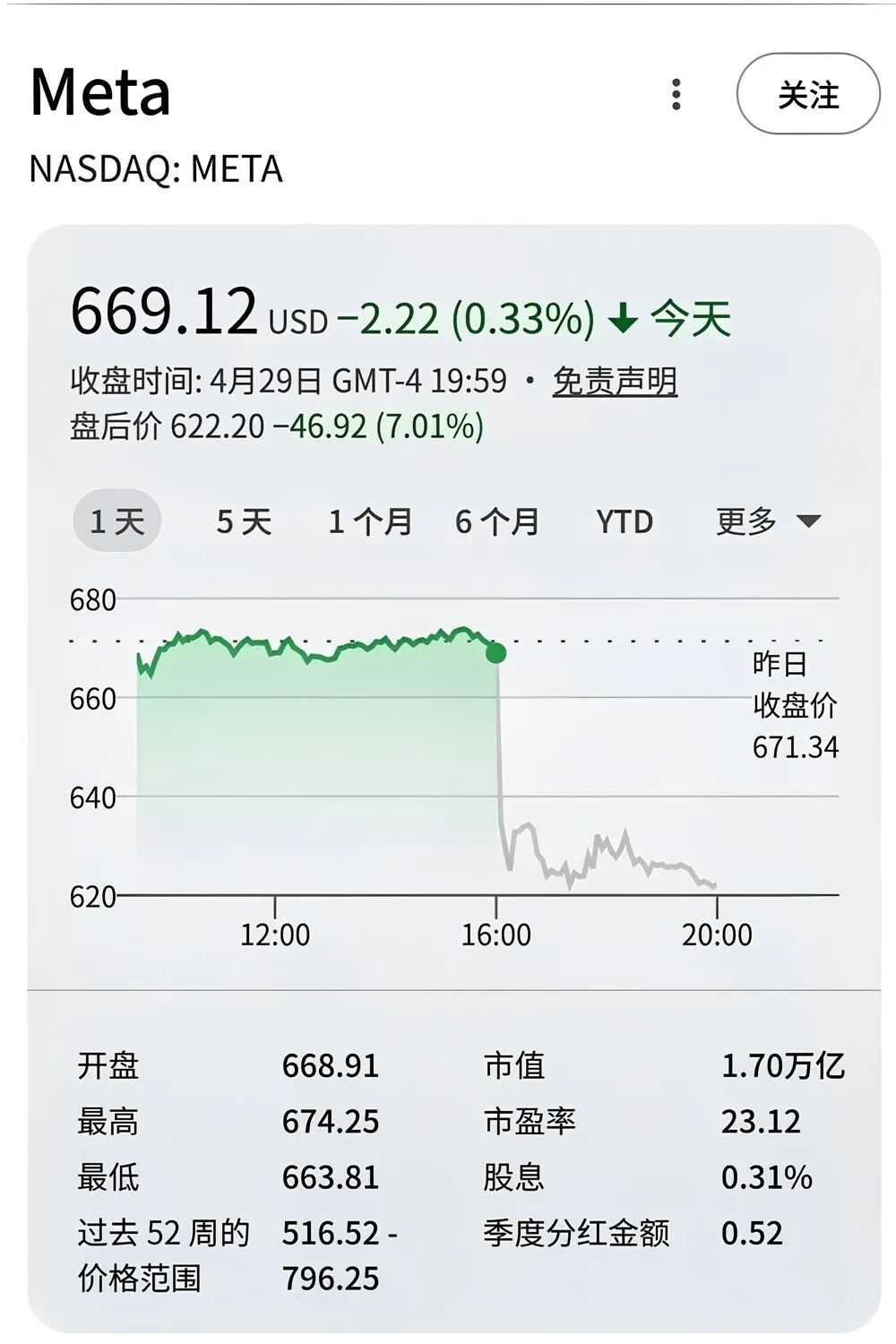 财报披露后,Meta股价在盘后交易中下跌超过7%,市值约1.70万亿美元。