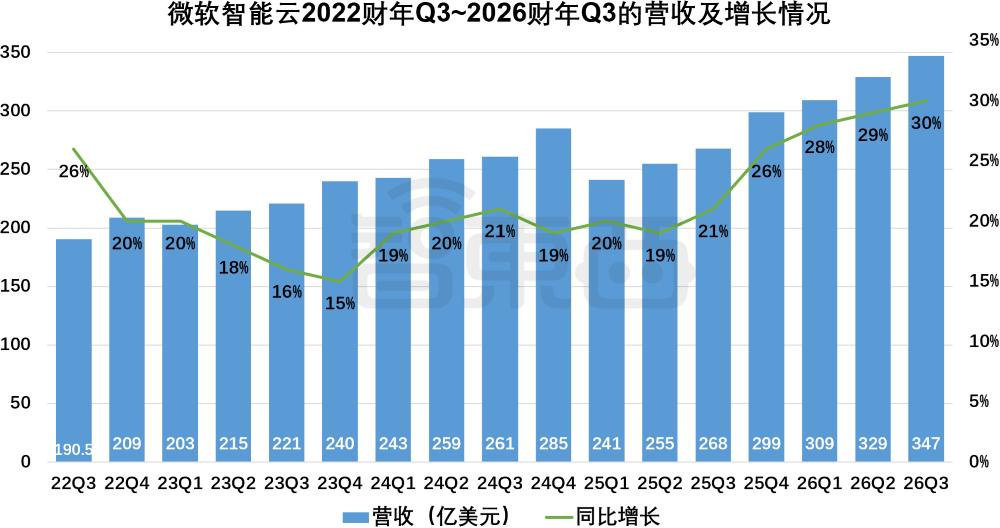 智能云业务收入同比增长30%。其中,Azure和其他云服务收入同比增长40%。