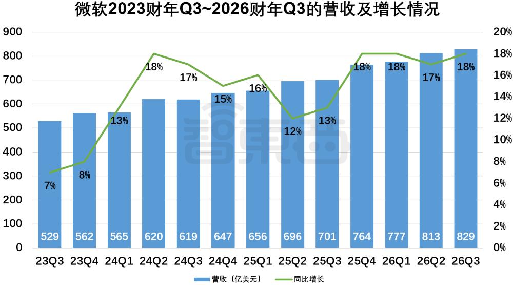 智东西4月30日报道,今日,微软公布2026财年第3季度(对应自然年2026年第一季度)财报。本财季,微软营收同比增长18%至829亿美元(约合人民币5668亿元),高于市场预期。按美国通用会计准则计算(GAAP),净利润同比增长23%至317.8亿美元(约合人民币2173亿元);按非美国通用会计准则计算(non-GAAP),净利润同比增长20%至317.9亿美元(约合人民币2174亿元)。