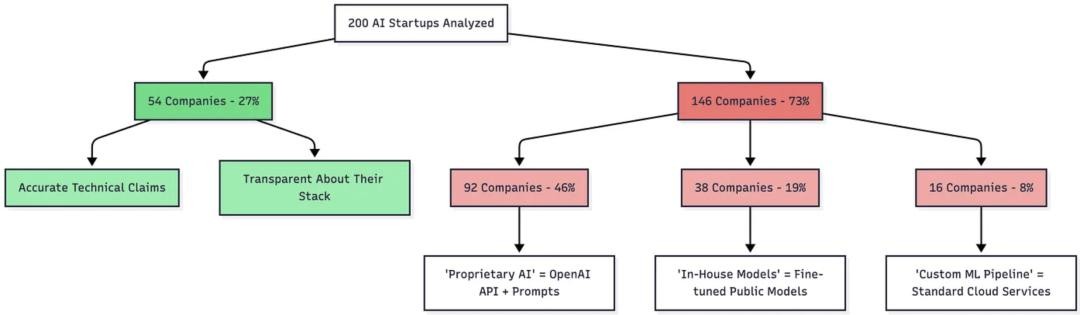 2025年11月,海外一位软件工程师Teja Kusireddy对 200家 AI创业企业进行了调研。发现“200 家AI创业团队中,高达73% 的产品实际上只是‘套壳’,主要套的还是 ChatGPT、Claude等公有大模型。”