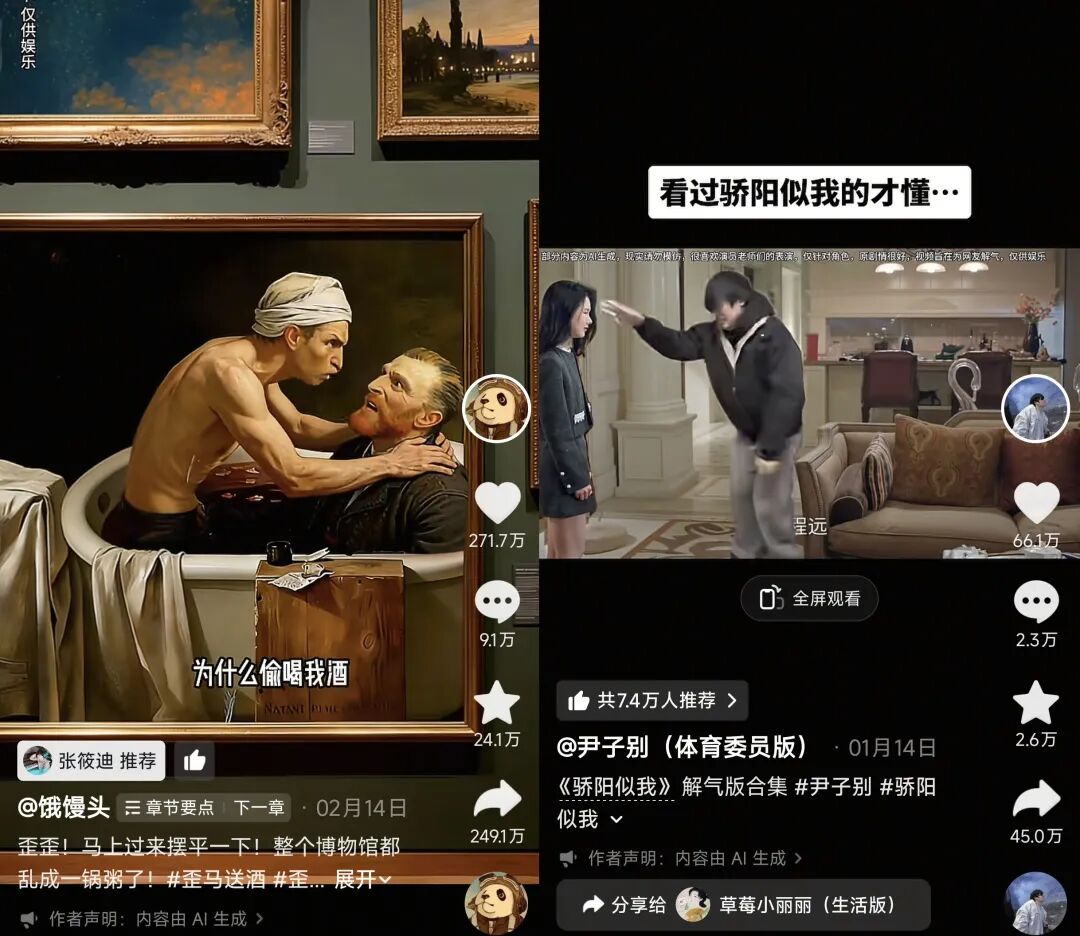 早在2019年,“饿馒头”就有了让名画动起来的脑洞,但限于成本和技术,作品更新极少,直到2024年,因为AI技术的进步,“饿馒头”的更新频次和作品质量有了极大提高,接连出了多个百万赞爆款视频。电视剧解气博主“尹子别(体育委员版)”靠着AI让自己穿越到电视剧中,教训一众行为奇葩、三观离谱的电视剧角色,营造出极大爽点,其中一条视频在抖音获赞376万。