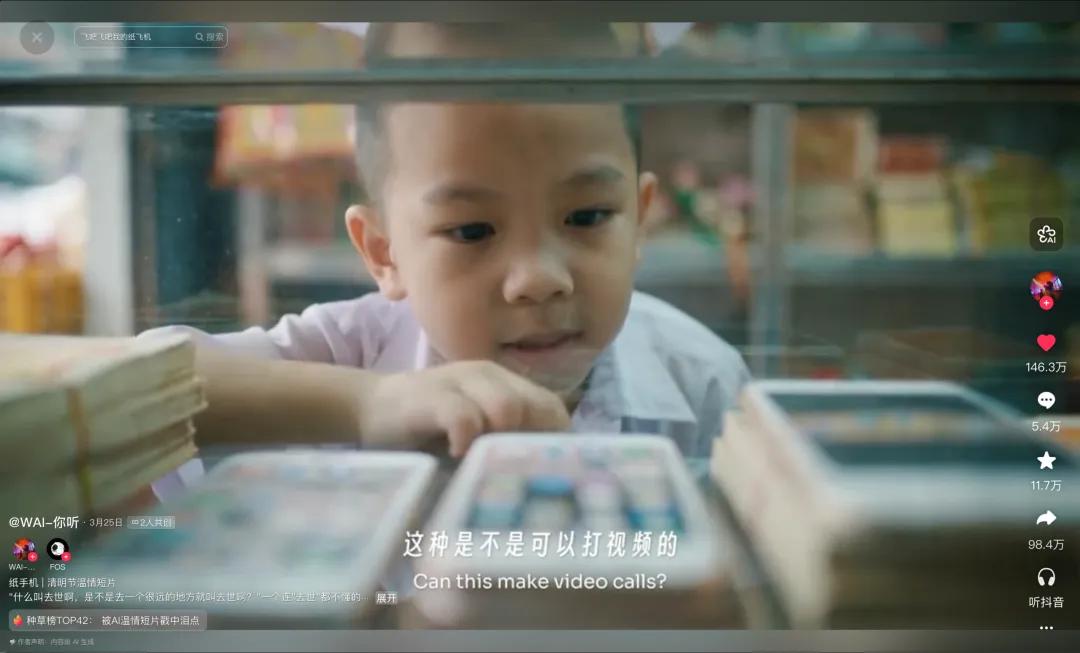 细腻的情感,影视级的画面,让《纸手机》的全网曝光量迅速攀升至2.3亿,并被央视新闻、人民日报等主流媒体转发。网友说它“用最没人味的AI,拍出了今年清明最有人味的短片”,还有人说“AI就该拍这样的片子”,“这才是AI的意义”。