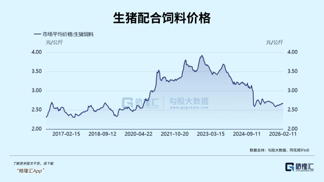 2026年一季度玉米批发均价达到2.33元/公斤,同比大幅增长8%,环比增长2.2%;育肥猪配合料价格维持在3.38元/公斤,同比持平,环比小幅增长0.6%,饲料价格已明确企稳回升。