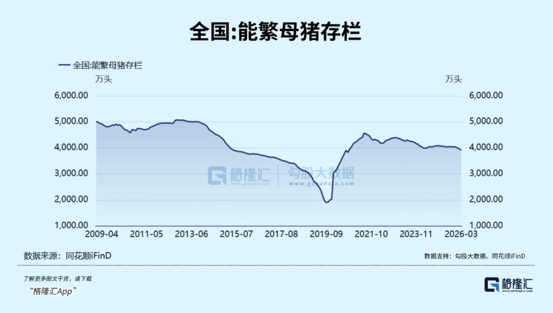 本轮猪价持续低迷的核心原因,正是产能去化的力度远远不够。根据农业部数据,截至2026年一季度末,全国能繁母猪存栏量降至3904万头,较2025年末仅去化57万头,相较于行业供需均衡的存栏水平,依然明显偏高。