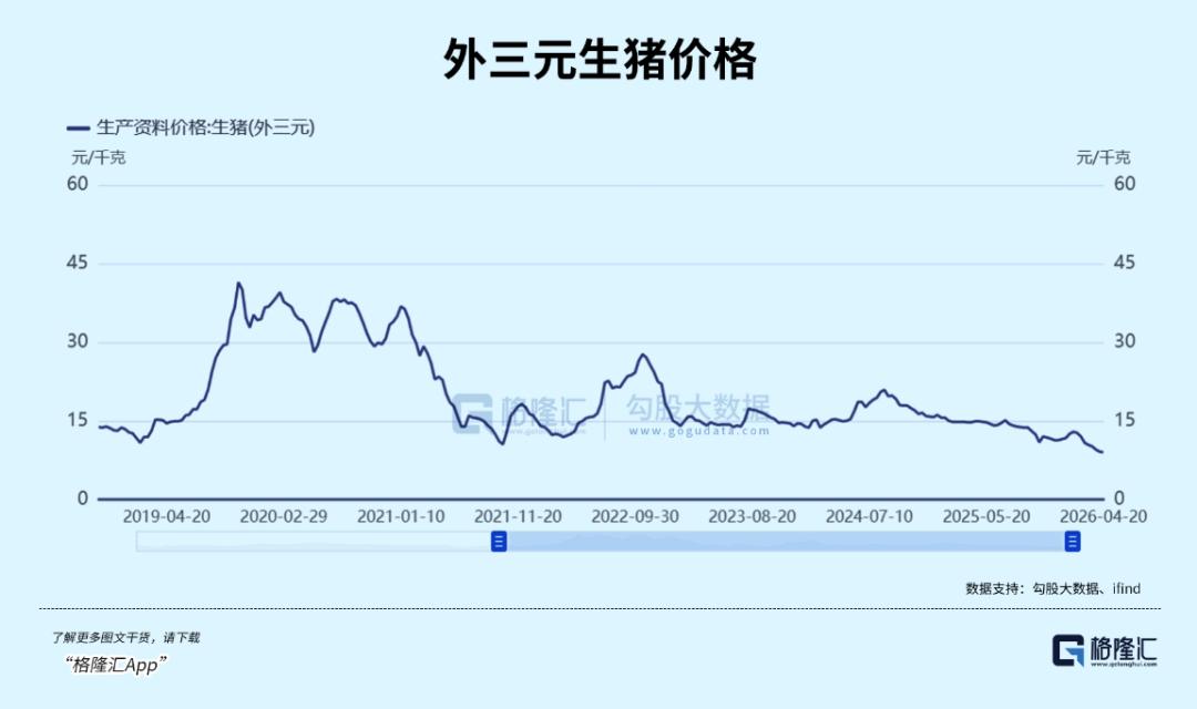 2026年以来,生猪养殖板块迎来了本轮周期最黑暗的时刻。4月全国生猪现货价格一度跌破9元/公斤,创下历史新低,全行业彻底进入深度亏损区间。