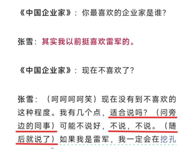 《中国企业家》杂志采访他,问他最喜欢哪个企业家。张雪回答,以前挺喜欢雷军的。然后话锋一转,表示如果自己是雷军,会更好地处理“挖孔机盖事件”。