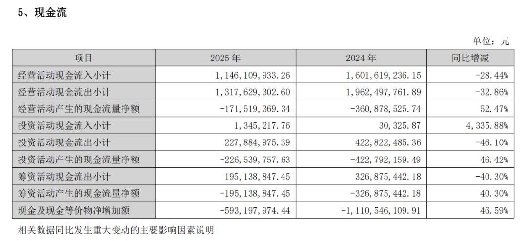 而年报披露,酒鬼酒2025年现金及现金等价物净减少5.93亿元,虽较2024年的11.1亿元收窄近47%,但仍处于净流出状态。