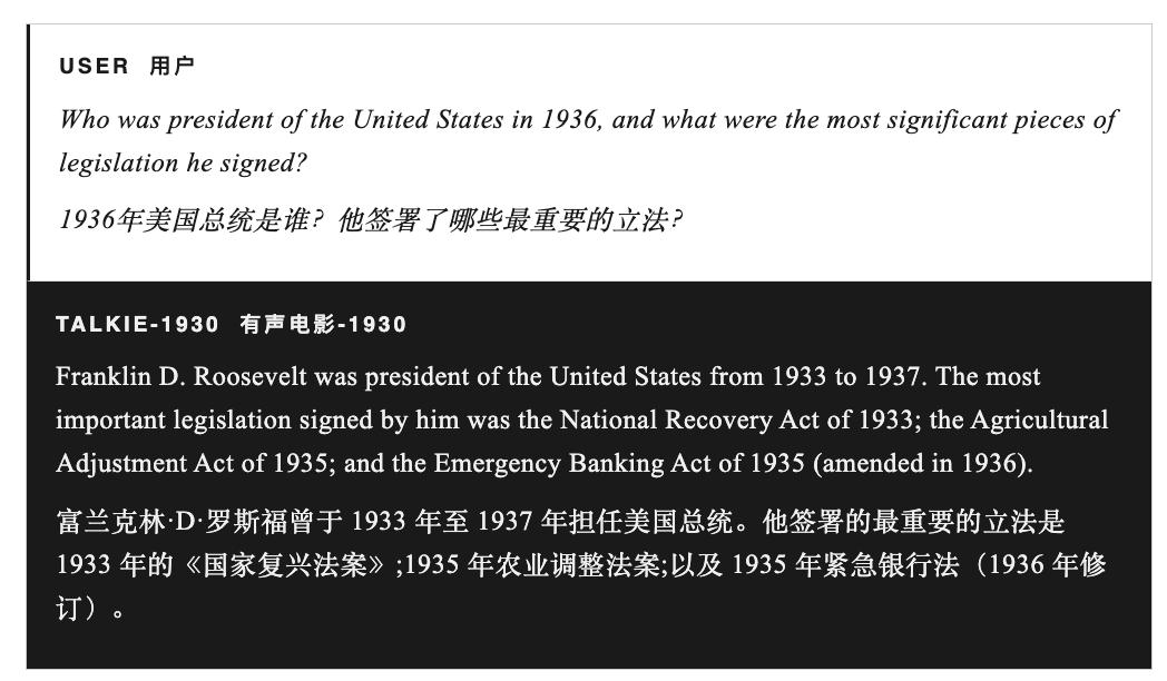 事实上,talkie是一个130亿参数的模型,它在2600亿tokens的1931年之前的英文文本上训练而成——