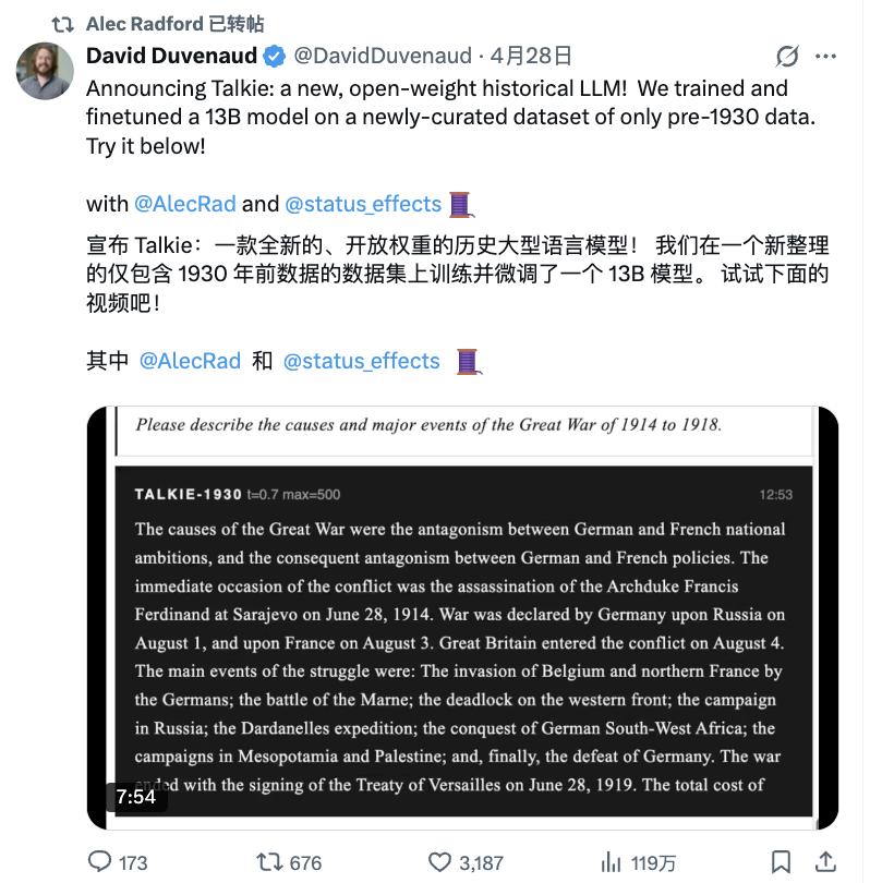 当全世界都在卷AGI、卷推理模型的时候,GPT系列之父本人,却跑去和搭档们造了一个只活在1930年的AI。