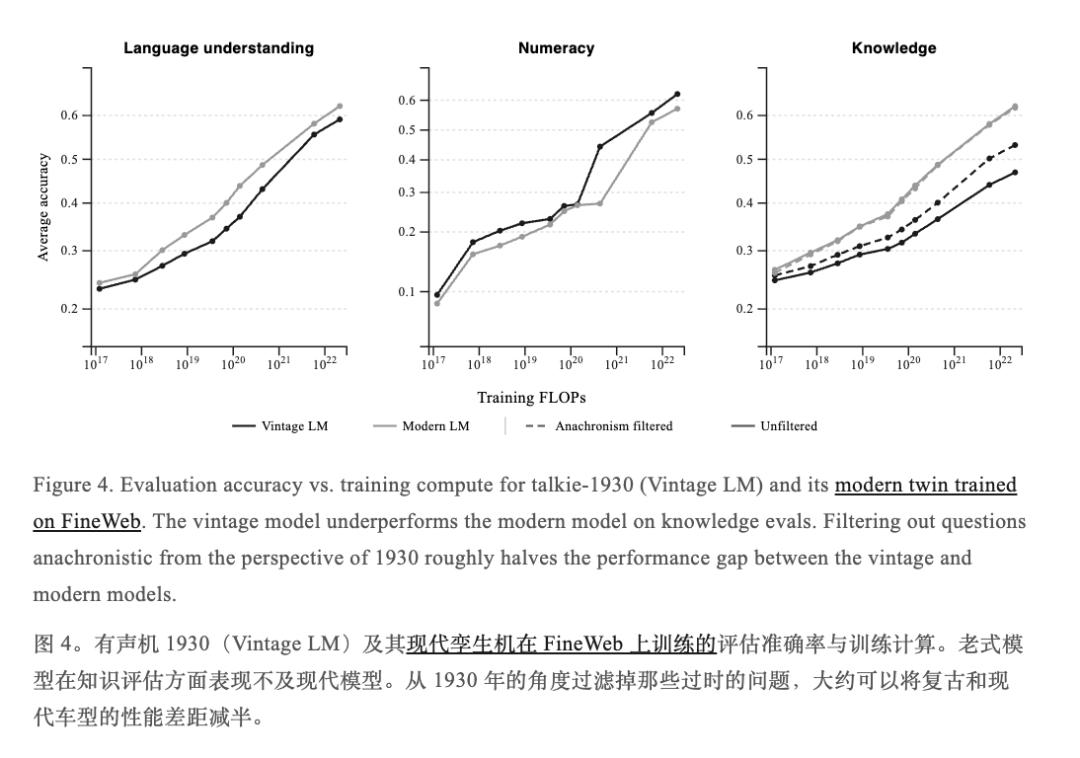 在这个测试中,团队还顺手把训练过现代互联网数据的同架构talkie-web也拉出来一起测,并画张对比折线图——