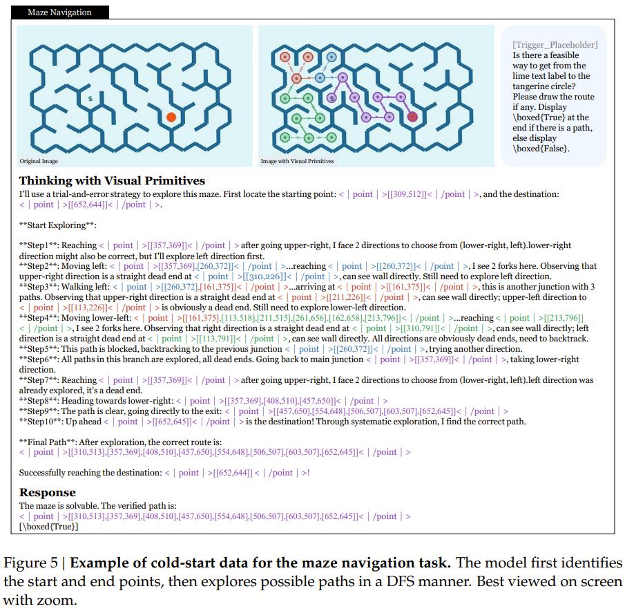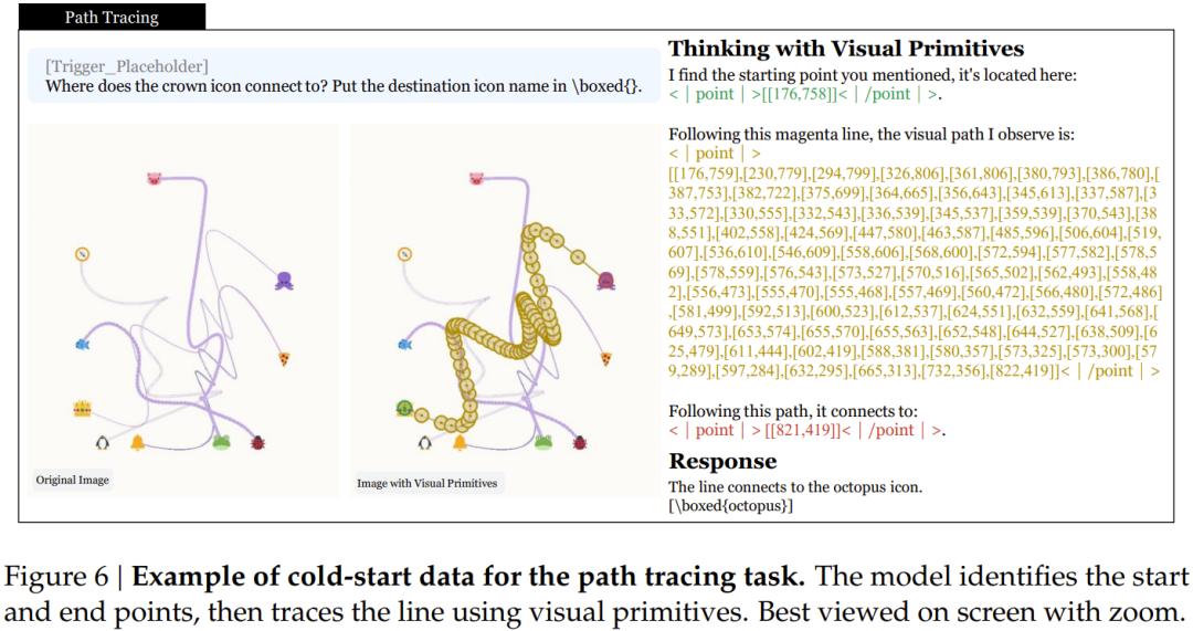 这套机制有两种「原语」(Primitives):边界框(<|box|>)用于需要定位和尺寸信息的对象;点坐标(<|point|>)用于更抽象的空间指代,比如迷宫探索轨迹或曲线追踪路径。