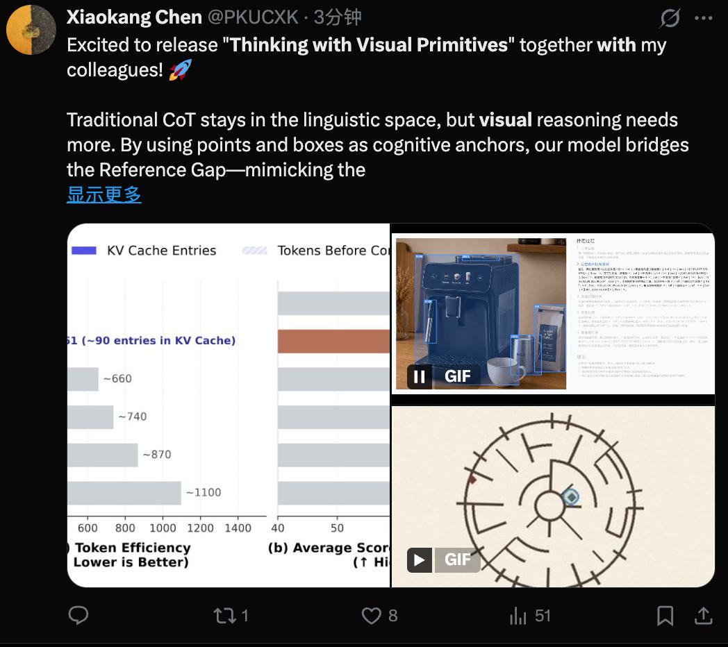 从这个角度看,「Thinking with Visual Primitives」更像是在给多模态推理增添一种「思考姿势」—— 一种人类在处理复杂视觉任务时本能就会使用、但 AI 此前一直缺失的姿势:用手指点着想。