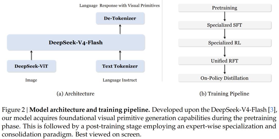 这项工作以 DeepSeek 刚发布的 V4-Flash 为语言主干 —— 这是一个 284B 总参数、推理时激活 13B 参数的混合专家模型(MoE)。视觉编码部分则使用 DeepSeek 自研的 ViT(视觉 Transformer),支持任意分辨率输入。