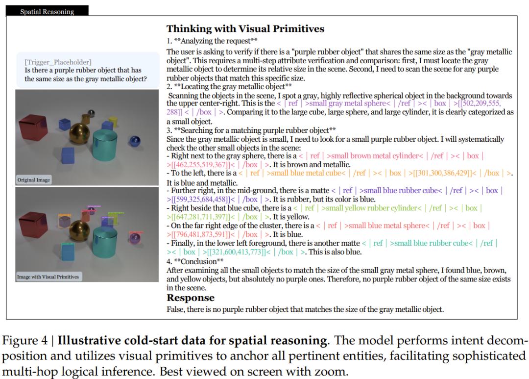 DeepSeek 的做法不同。模型在推理过程中,每当提到一个视觉对象,就同步输出它的坐标: