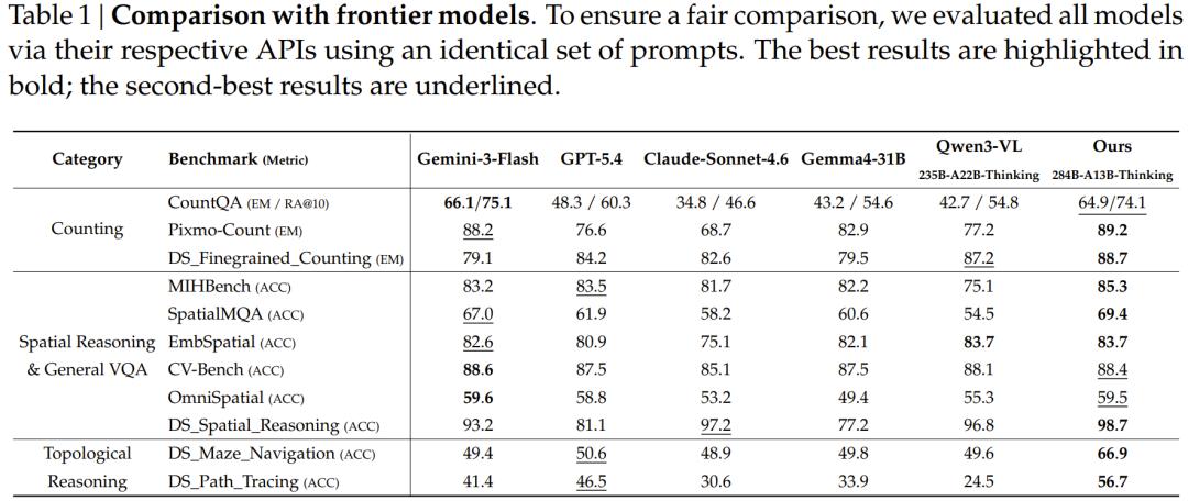 论文在 11 个基准测试上进行了评测,与 Gemini-3-Flash、GPT-5.4、Claude Sonnet 4.6、Gemma4-31B、Qwen3-VL-235B 等主流模型对比(所有 frontier 模型均通过 API 评测,使用统一提示词)。
