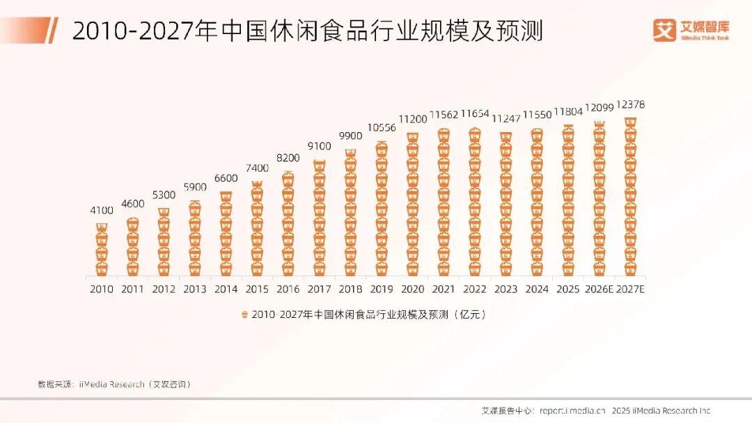 据艾媒咨询所发布的《2025年中国休闲食品行业发展状况与消费行为调查数据》,2025年国内休闲食品的市场规模为11804亿,预计到2027年将会增长到12378亿。作为真正意义上的万亿规模市场,虽说新鲜零食在其中的占比相对还比较低,不过整体市场已经处在快速扩容通道。