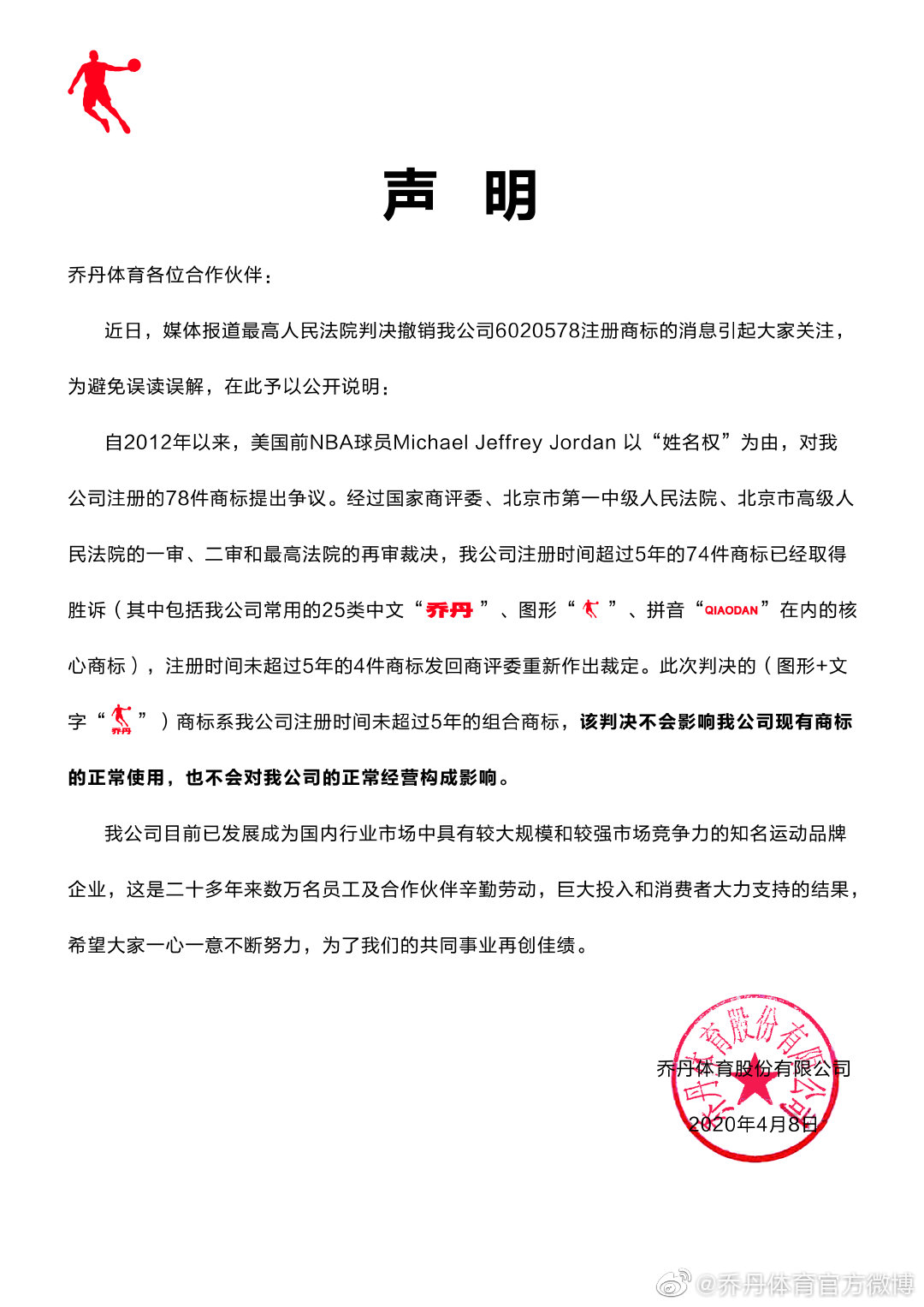 结合“乔丹”商标纠纷案的终审判决书和乔丹体育在4月8日发布的声明,此次迈克尔·乔丹胜诉的仅有4件注册商标,败诉的有74件。