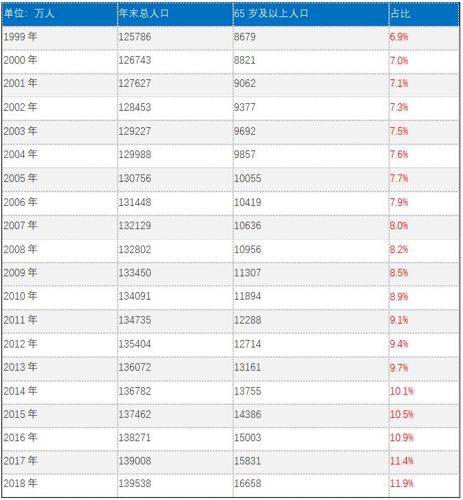 到2018年,我国65岁以上的人口占比也才11.9%,而全球老龄化率第一的日本这一比例已经达到27%,美国也已经达到16%,但由于我国巨大的人口基数,我国65岁以上人口达到了1.66亿,60岁以上人口数达到2.5亿,从绝对数上看,我国是全球老年人口数最多的国家。