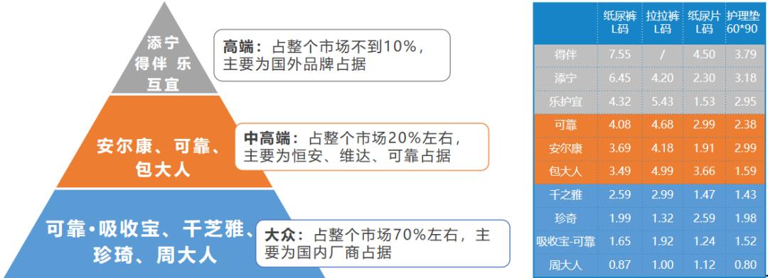 国外品牌主要定位高端市场,单片纸尿裤价格在4元以上;