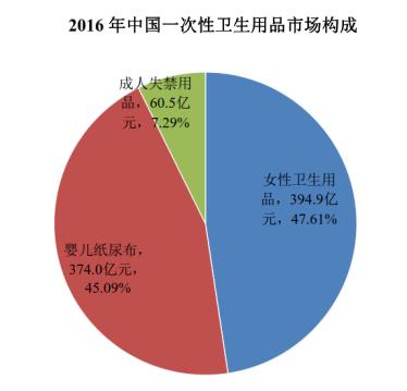 虽然同属于一次性卫生用品,但是从市场份额来看,成裤要比婴裤、女性卫生用品要小得多。根据2016年数据,我国成裤市场规模60亿,而婴裤和女性卫生用品市场规模都在400亿左右,前者仅为后两者市场的15%。