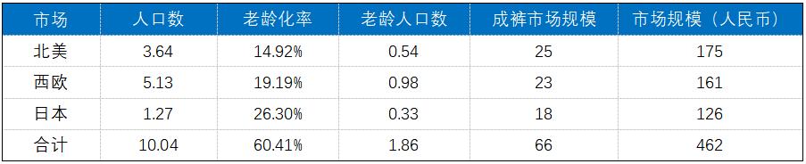 而从全球的情况来看,北美、西欧、日本合计人口数10亿,成裤市场规模将近500亿,各自均在100~200亿元之间。