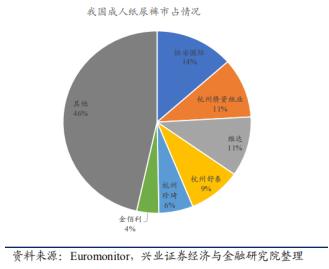 根据欧睿国际数据,2018年我国成裤品牌占有率最高的是恒安国际(品牌“安尔康”),除此之外,杭州可靠(“COCO 吸收宝”)、维达(“添宁”、“包大人”)、杭州舒泰(“千芝雅”)、杭州珍崎及金佰利,前六大企业占据了市场 54%的份额。