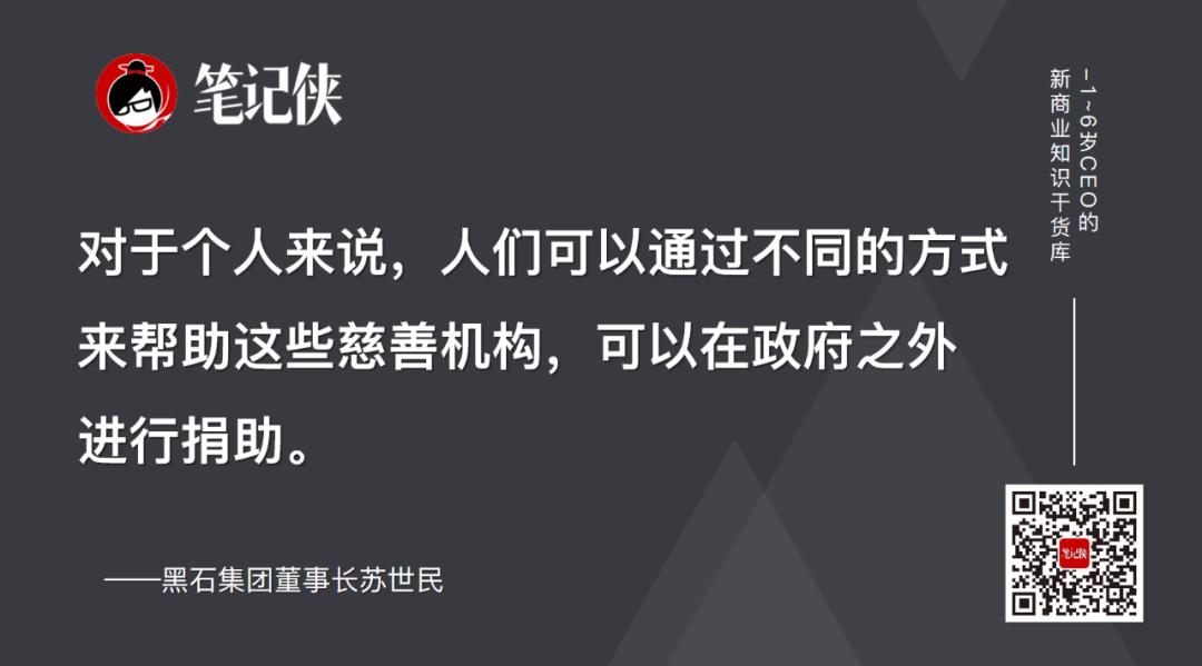 苏世民(黑石集团董事长):每个国家有各种不同捐赠的文化。我们可以看到,美国一直有非常强大的捐赠文化,像商界的人会捐助一些医院或者其他公益机构。在其他一些国家,也有类似的捐赠文化。