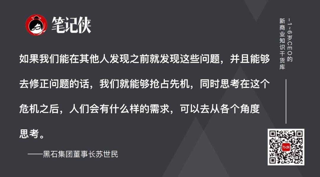 苏世民(黑石集团董事长):有的时候,我们就像医生一样,要诊断出危机能够给我们带来什么样的影响。如果我们能在其他人发现之前就发现这些问题,并且能够去修正问题的话,我们就能够抢占先机,同时思考在这个危机之后,人们会有什么样的需求,可以去从各个角度思考。