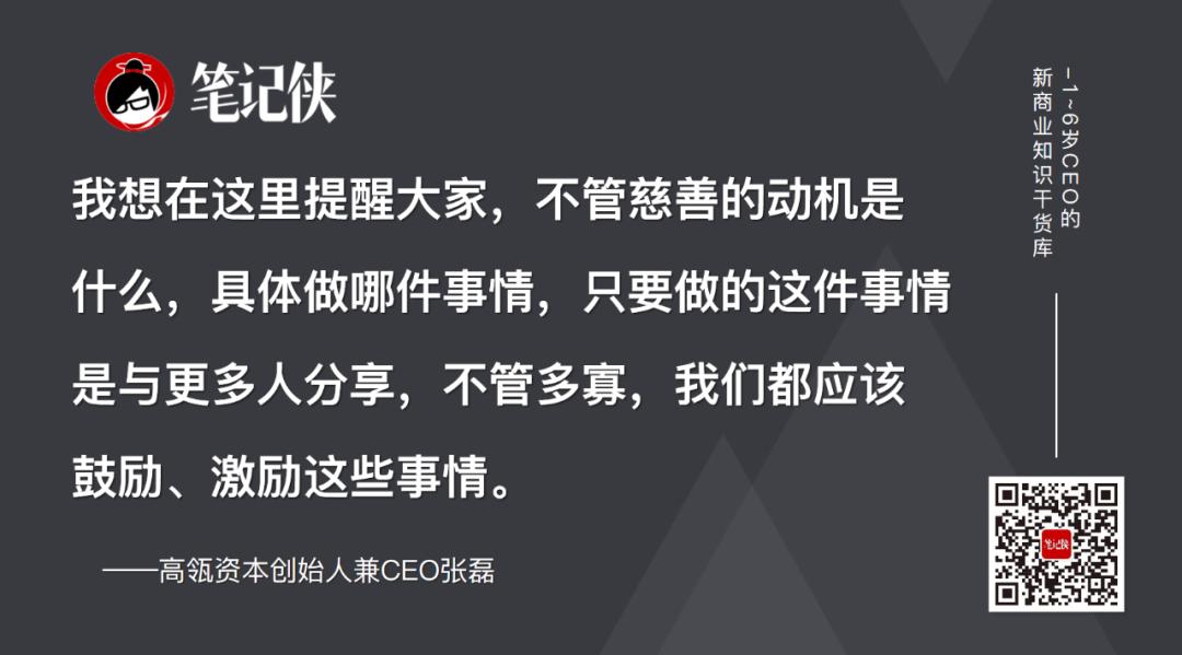 我想在这里提醒大家,不管慈善的动机是什么,具体做哪件事情,只要做的这件事情是与更多人分享,不管多寡,我们都应该鼓励、激励这些事情。
