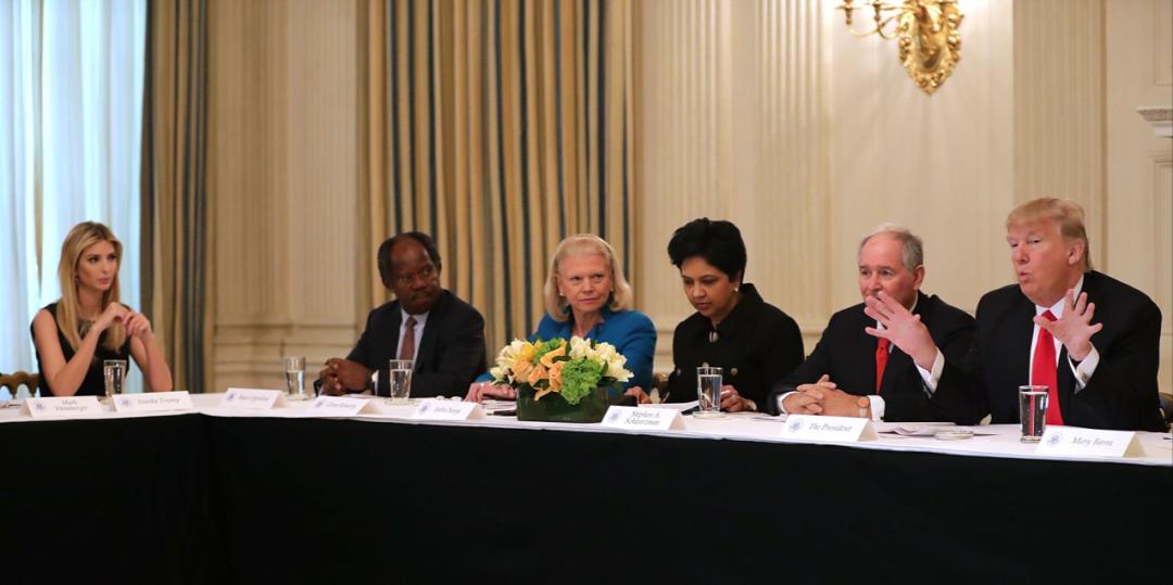 2017年2月3日,白宫,特朗普和战略与政策论坛部分成员(左起伊万卡,GIP奥贡莱西,IBM罗睿兰,百事努伊,苏世民,特朗普)