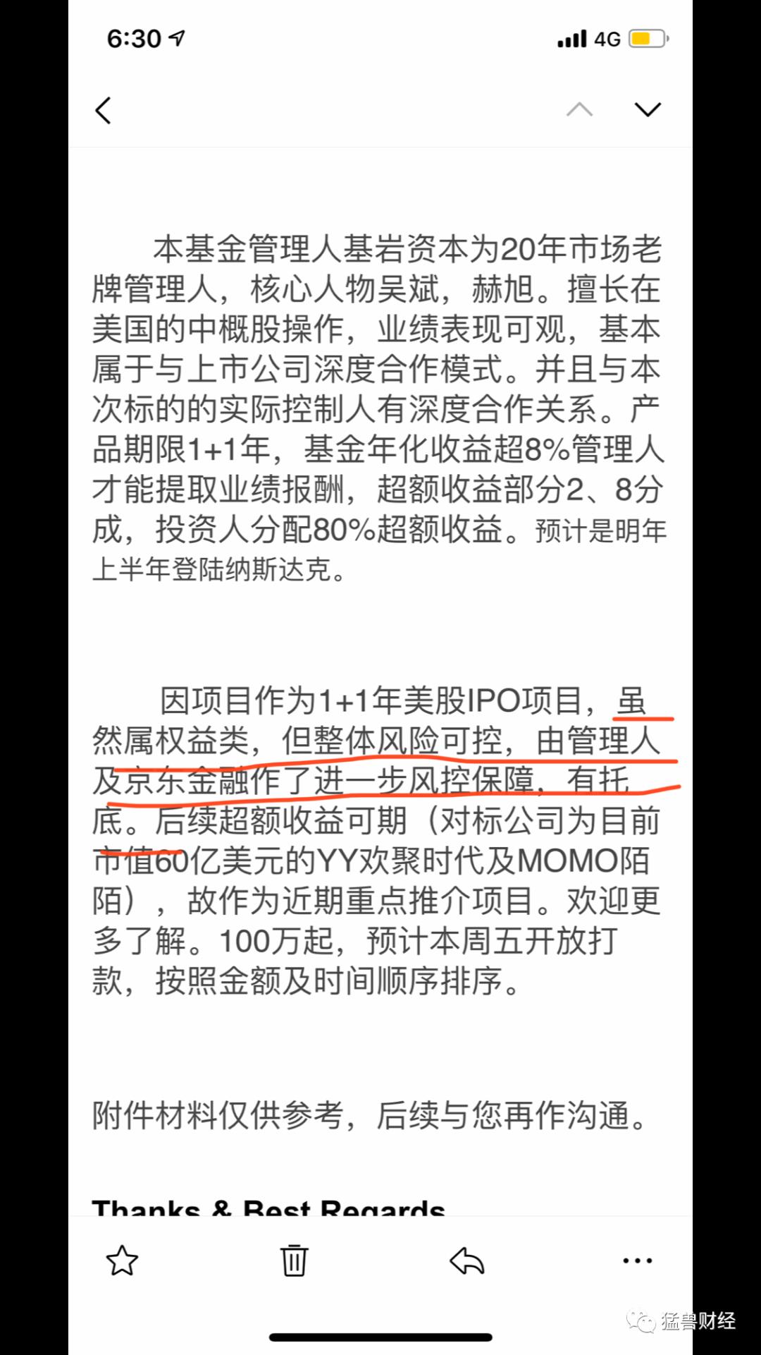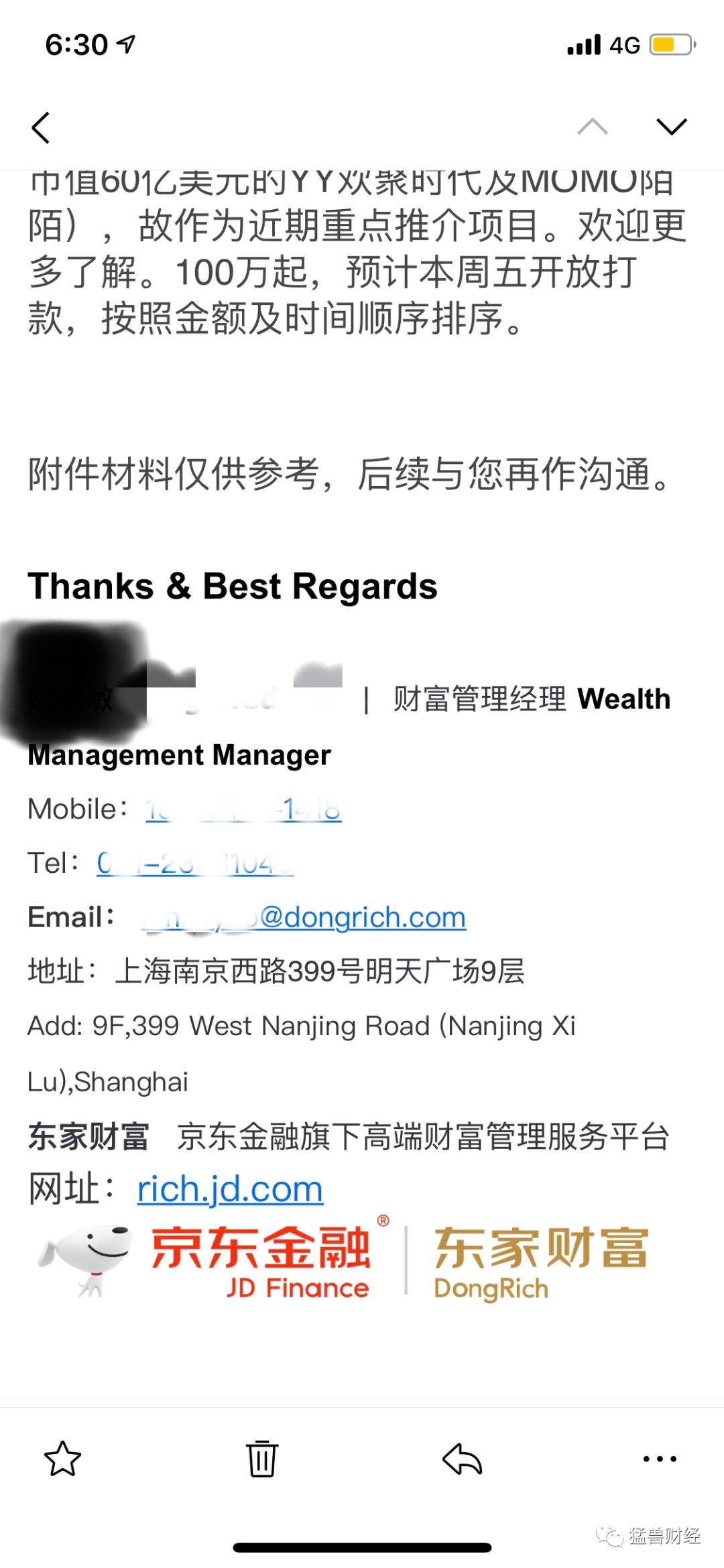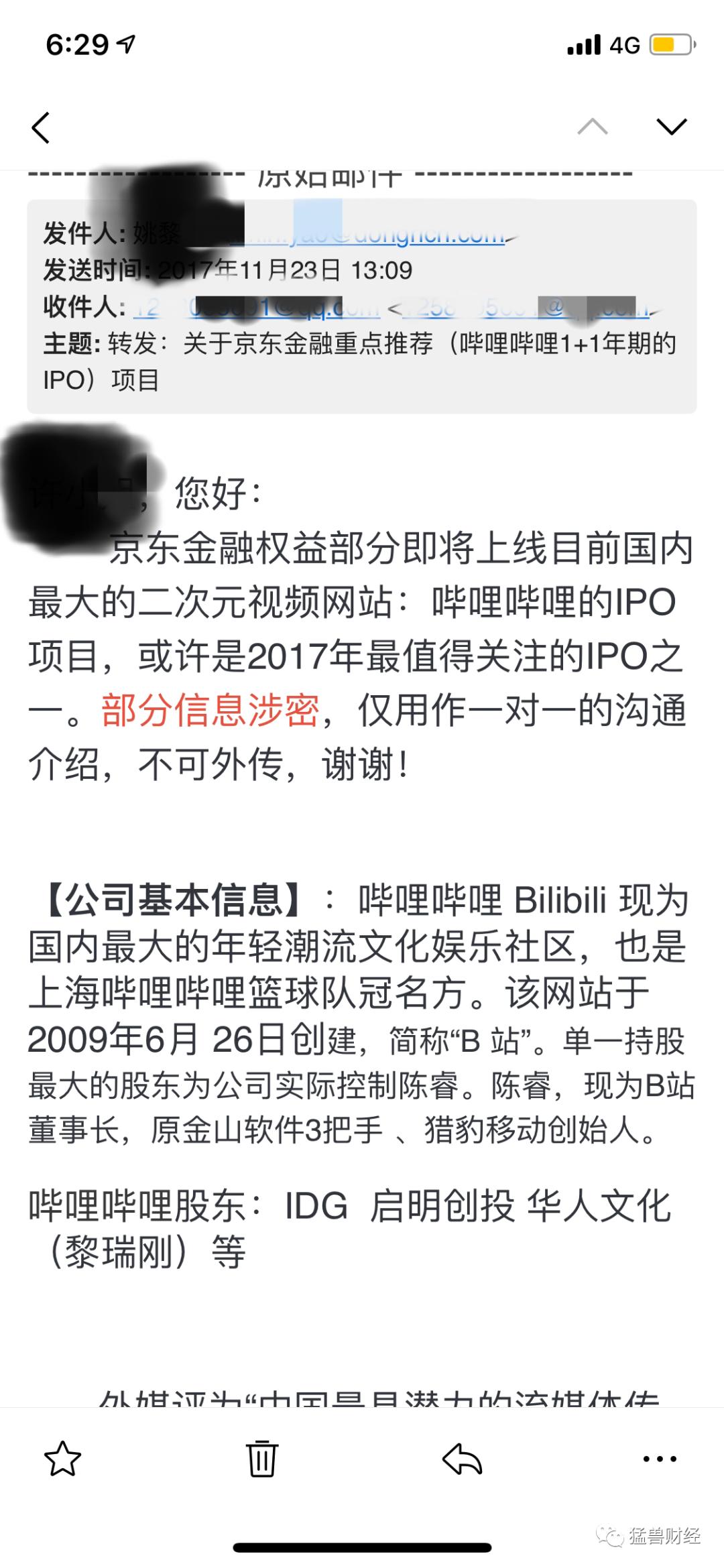 由投资者提供的东家金服的销售人员的邮件显示:京东金融权益部分即将上线目前国内最大的二次元视频网站,哔哩哔哩的IPO项目,或许是2017年最值得关注的IPO之一。邮件内容还提到:虽然属于权益类,但整体风险可控,由管理人及京东金融做了进一步风控保障,有托底,后续超额收益可期。