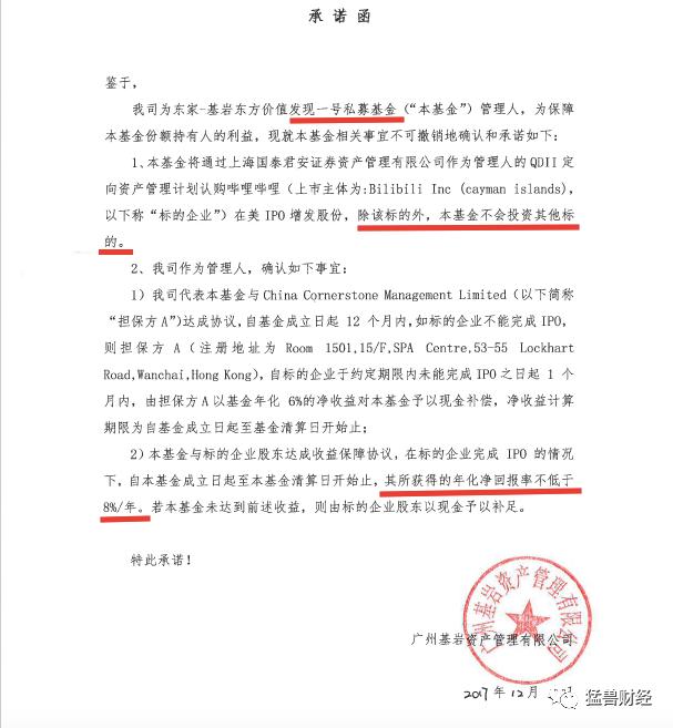 根据投资者提供的基岩资本于2017年12月给到投资者的承诺函,"本基金通过上海国泰君安证券资产管理有限公司作为管理人的QDII定向资产管理计划认购哔哩哔哩(上市主体为:Bilibili Inc(cayman island))在美IPO增发股份,除该标的外,本基金不会投资其他标的。”且表示,“其所获得的年化净回报率不低于8%/年。"
