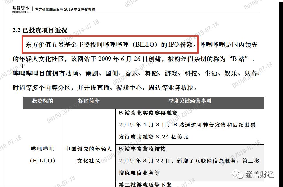 但猛兽财经在她提供的《东方价值基金五号2019年2季度报告》里发现,报告里载明:五号基金主要投向哔哩哔哩。并非如之前所传的全部投向哔哩哔哩。一词之差,谬以千里。