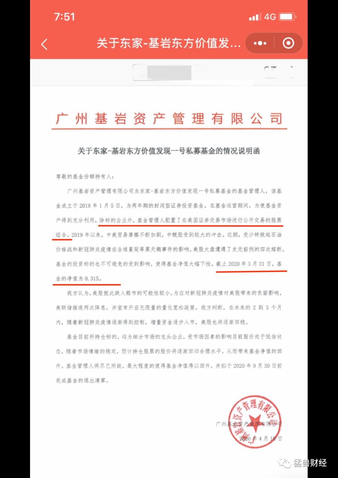 “一号基金的净值跌到 0.315,是事实”,一名投资者对猛兽财经表示,4月10日,东家金服的销售给投资者出具了《关于东家-基岩东方价值发现一号私募基金的情况说明函》,说明函显示,截止到2020年4月10日,这款产品的净值为0.315。