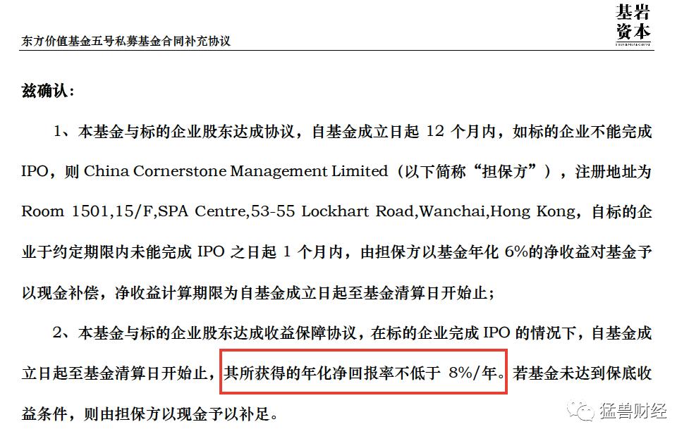 承诺保收益属实。在投资者提供的《基岩资本东方价值五号私募基金的补充协议》里,提到:其所获得的年化净回报率不低于8%/年。