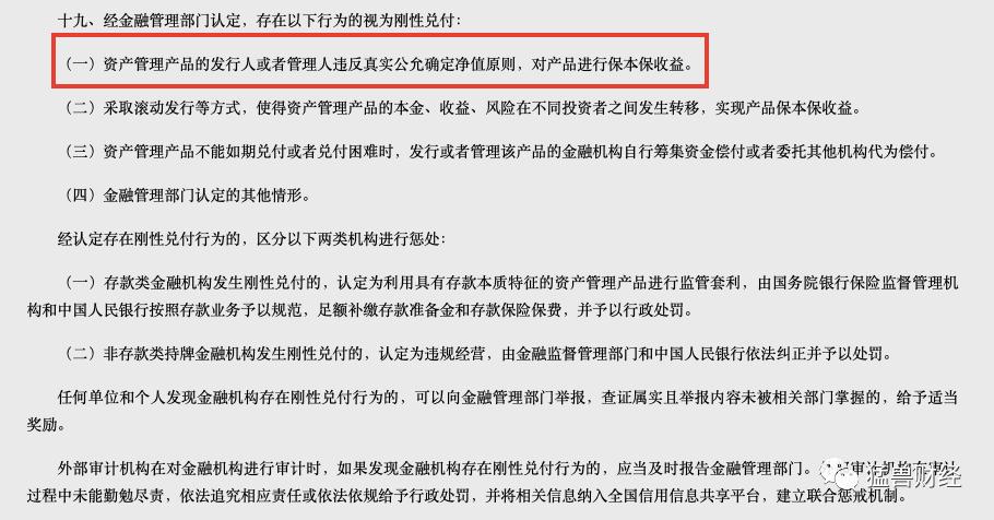 而根据2018年4月中国人民银行、银监会、证监会、国家外汇管理局联合发布的《关于规范金融机构资产管理业务的指导意见》,对产品进行保本保收益被视为刚性兑付,刚性兑付是明令禁止的违规行为。