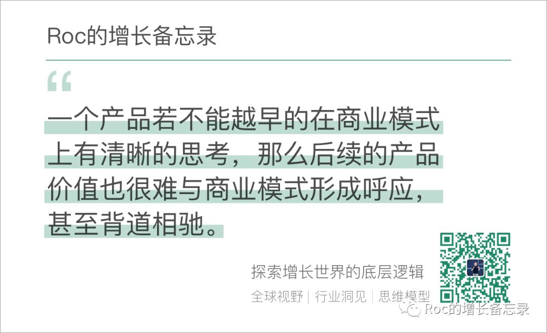 现在越发能感受与观察到,一个产品若不能越早的在商业模式上有清晰的思考,那么后续的产品价值也很难与商业模式形成呼应,甚至背道相驰。越早同时思考清楚这两点,越知道产品的发展方向在哪,比如优秀的:今日头条和得到。