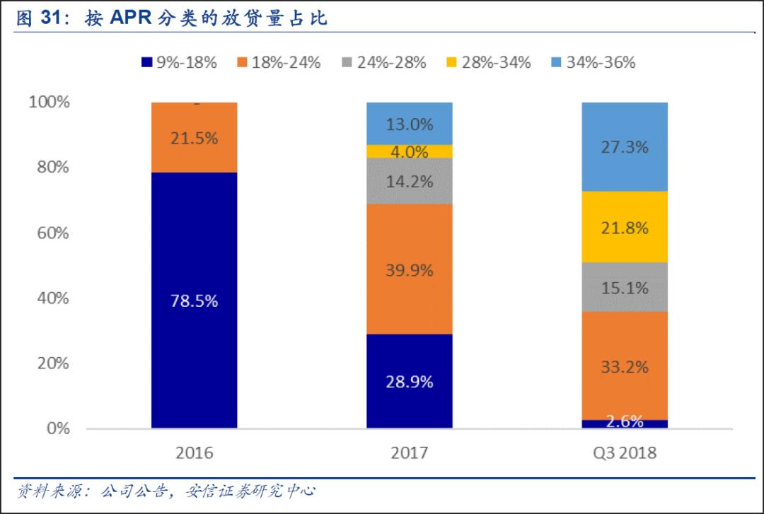 360金融过去几年大幅提高APR超过24%以上贷款产品的增长路径(见下图。另,360金融年报里披露的2017-2018年APR超过24%的未偿还贷款余额占比由43.5%增加到71%),已经黄鹤一去不复返了。