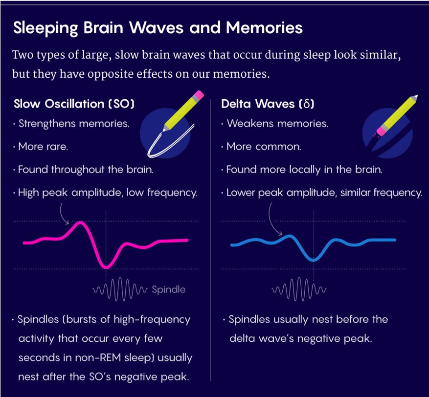 长达数十年来,对于增强和丢失记忆的研究都主要集中在两种脑电波模式上:慢震荡(slow oscillations)和“睡眠纺锤波”(sleep spindles)。慢震荡,以高峰值和低频率为特征,扫过大部分的脑区。睡眠纺锤波是在非快速眼动睡眠期(没有快速的眼动并且一般很少做梦的睡眠阶段)每隔几秒钟出现的高频活动的爆发(bursts)。当与睡眠纺锤波相结合时,慢震荡变得对于记忆的巩固至关重要。相比之下,δ波比慢震荡略小,并且倾向于在大脑局部出现。因为慢震荡和δ波一般在睡眠中同时出现并且很难区分,通常它们一起被归为慢波。