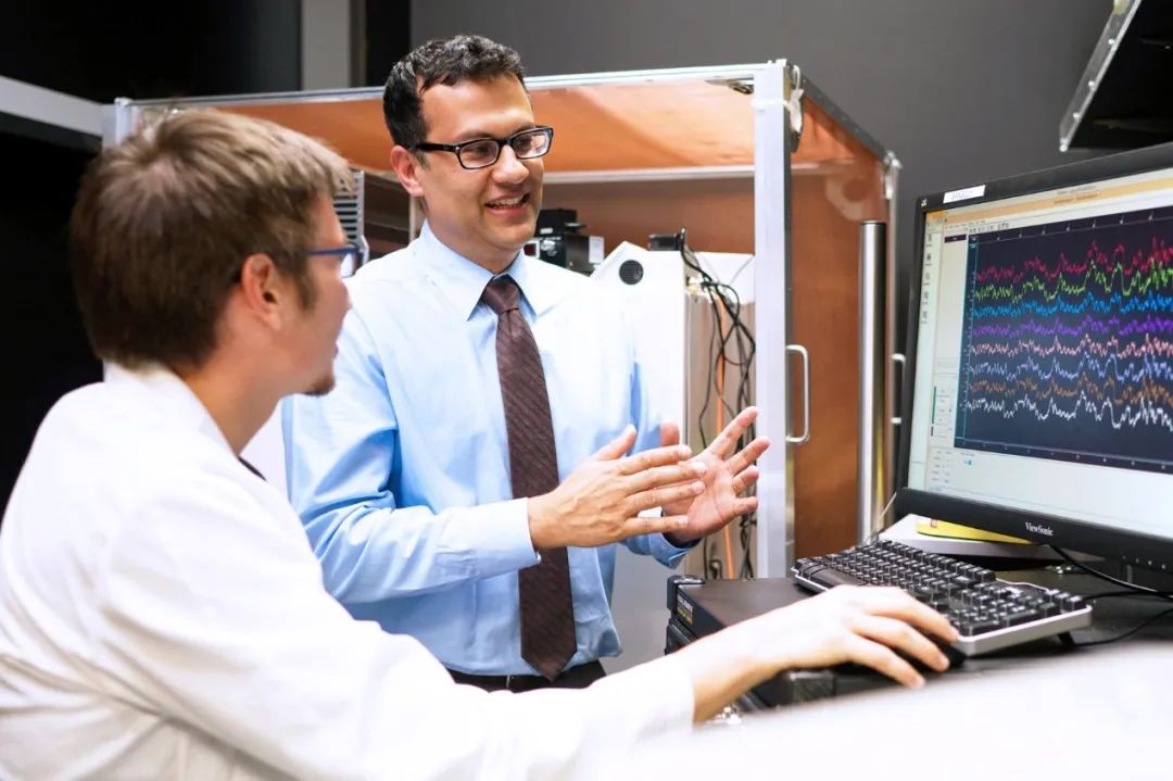 在美国加州大学旧金山分校,神经科学家卡努纳什·甘古利在他的实验室里与一个同事交谈。屏幕上显示的是他们所研究的慢震荡和δ波的波形。(译者注:右为甘古利)