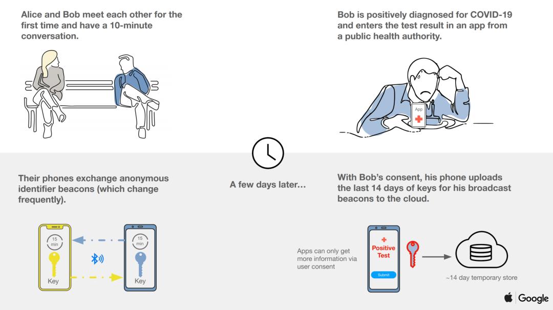 假设有两个人,他们碰巧在这10分钟的时间内,距离靠得很近,他们的手机会互换匿名标识符,这些标识符每15分钟更换一次。如果后来,其中一个人不幸被诊断出患有新型冠状病毒肺炎,并通过集成了API的公共卫生局应用程序将其输入到系统中。