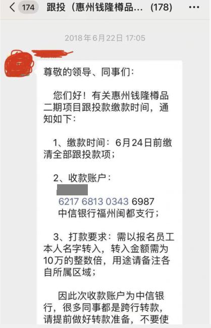 福晟惠州项目的跟投缴款通知 资料来源:受访者提供