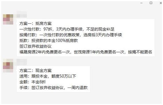 再如抵房方案的福晟漳州黄金海岸项目(现案名为云樾鹭海),2017年由福晟收购而来,2019年没有按期收回本金及利息,如今这个集资项目却成了抵购项目。该项目原先向员工以2万元/平米价格集资,允诺到期按3万/平米公司会回购。而现在公司给出的抵购房房源单价仅1.6万元/平方米。