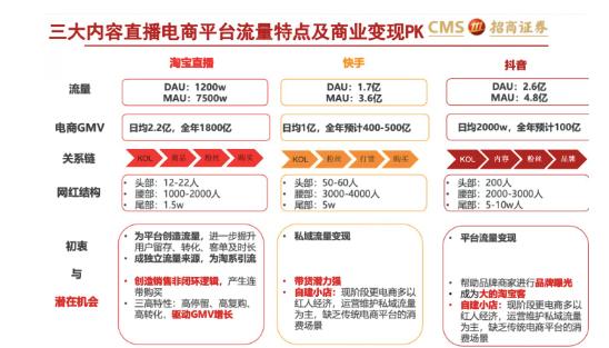 据《招商证券调研报告》数据显示(下图),目前淘宝直播、快手、抖音是国内三大内容直播电商平台。在流量上抖音高于快手和淘宝直播。而在电商GMV上,淘宝直播日均2.2亿,全年1800亿,快手日均1亿,全年预计400-500亿。而抖音日均2000万,全年预计100亿。