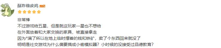 而正如攀比心理在动森中会获得真实的投射,作弊、偷窃等现实社会中存在的现象,也会随着大量玩家的涌入投射到这个游戏中——甚至因为这是个更自由的没有惩罚的世界,玩家行为会更不受拘束,“恶”也会更容易释放。