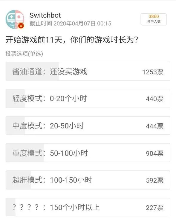 在一项有3860人参与的“开始游戏前11天,你们的游戏时长为?”投票中,我们多少感受到大家肝动森的辛苦。在2607位玩家中,有6成以上每天游戏时长超过4.5小时以上,更有3成玩家每天游戏时长超过9个小时。