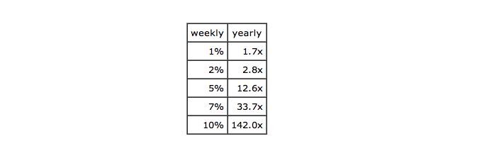 这张图说明的道理显而易见,如果一家公司每周的增长率是 1%,那么其一年的增长率就是 170%;而当其每周增长率为 5% 时,其一年的增长率就是 1260%。