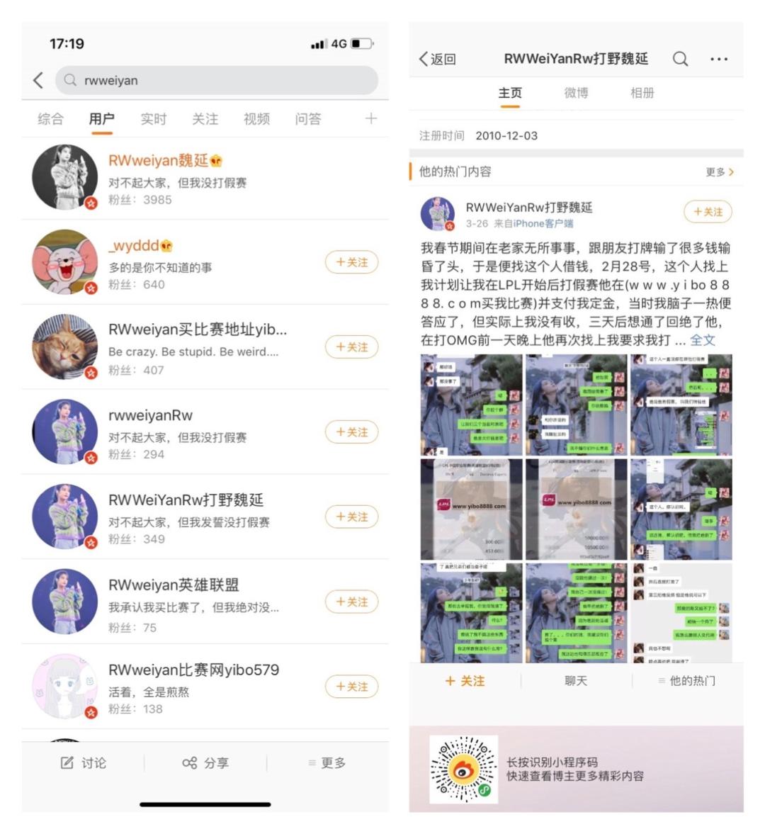 最值得玩味的是,就在选手王湘发布了辩解微博之后不久,这个“RWWeiYan”帐号也注销了,在微博上如今已搜索不到。但选手王湘当时发布的那条辩解微博后,微博上一夜间冒出了大量假“魏延”。这些帐号模仿选手王湘的微博原有ID、发帖历史和头像,炮制了无数个“rw+weiyan”。