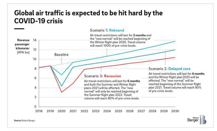机场越发冷清,航司越发焦虑。按罗兰贝格的预测,乐观来看,如果疫情下的航空旅行限制持续2个月,到2020冬春航班开始时(即2020年11月初)全球民航业的RPK(收入客公里)可达到疫情之前100%的水平;悲观来看的话,不仅影响要持续到2022夏秋季航班开始之前,并且RPK只有疫情之前80%的水平。