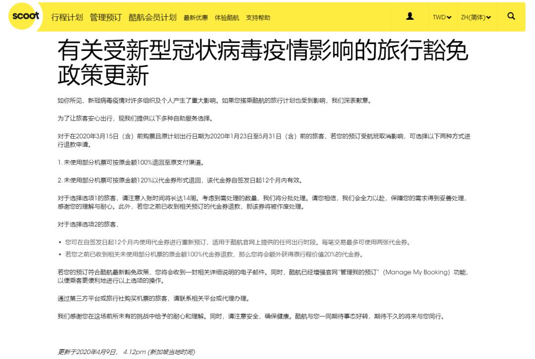 举个例子,新加坡酷航在3月16号发布消息提示,除酷航取消航班外,在2020年3月15日(含)前购票,且预订出行日期为2020年1月23日至2020年5月31日(含)的游客,若改变旅行计划,未使用部分机票可按原金额100%以代金券形式退回,代金券有效期为自发出之日起12个月内。